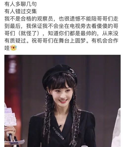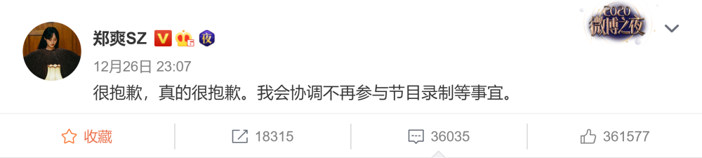 所以在26日深夜,她直接发了一条:“很抱歉,真的很抱歉。我会协调不再参与节目录制等事宜。”