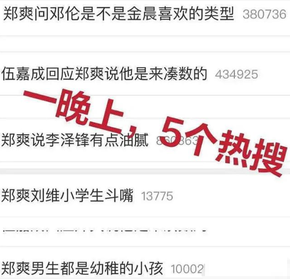 最新一期节目,霸屏的五个热搜中,“郑爽问邓伦是不是金晨喜欢的类型”、“郑爽说李泽锋有点油腻”、“郑爽刘维小学生斗嘴”,三个都和郑爽有关。