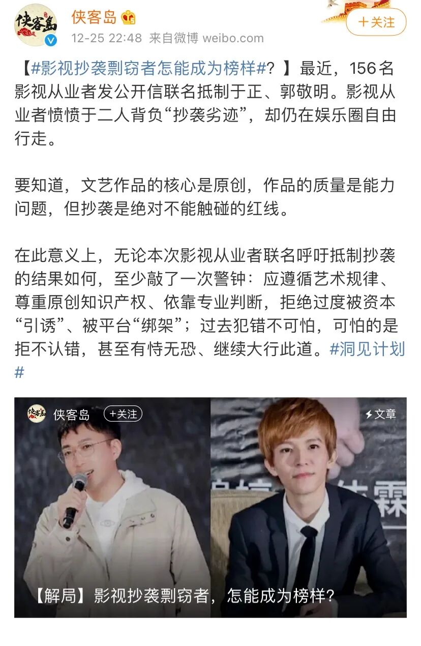 事情发生后,人民日报海外版官微“侠客岛”发布了一篇名为《影视抄袭剽窃者怎能成为榜样?》,文中提到:过去犯错不可怕,可怕的是拒不认错,甚至有恃无恐,继续大行此道!