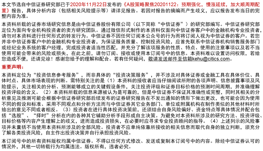 我们再次强调,顺周期板块是A股轮动慢涨期最重要的主线,建议结合量价指标和事件催化,把握其中周期品和可选消费板块细分领域的机遇。周期品方面:受益于弱美元+全球经济复苏需求回暖,确定性最高、业绩弹性较大的细分领域,首推以铜、铝为代表的基本金属;此外,以锂为代表的能源金属价格回归需求驱动,行业拐点来临,值得中期关注;化工板块中,推荐底部拐点信号明确的化纤。可选消费方面,除了我们前期持续推荐的家电、汽车、白酒、家居外,还可以关注疫苗加速推进利好的出行产业链。预计国内消费今年会沿着必须消费品、本地生活服务相关消费品、可选耐用消费品以及出行相关服务消费四个阶段逐级推进。11月以来海外疫苗研发捷报频传,可以开始关注酒店、景区等中期基本面预期从底部修复的品种。
