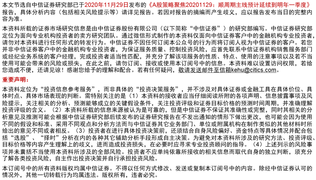1)预计此轮顺周期行业的盈利修复顶点出现在明年一季度。我们预计2020Q4~2021Q3工业板块净利润增速分别为25.5%、200%、18.0%和21.0%;消费板块(主要依赖可选消费)净利润增速分别为40.2%、47.1%、10.0%和8.0%,预计明年工业和消费板块成为后续板块景气接力的主要驱动力。