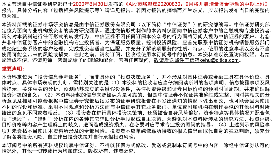 A股在9月将开启增量资金驱动的中期上涨:增量资金提供了上行的动力;扰动因素消散打开了上行的空间;基本面表现优异抬升了市场的底线。首先,海外货币宽松预期强化,预计美元的宽松周期至少持续至明年二季度;国内政策重“定向”而非“转向”,且结构性的流动性引导也更有利于股市;同时,居民部门增配权益趋势延续,A股相对其它资产吸引力提升;9月A股增量资金流入预计将再次提速。其次,中美争端带来的扰动高峰已过;创业板注册制平稳落地,涨跌幅放宽并未造成市场冲击;同时,中报已平稳收官,解禁减持的压力高峰已过。最后,预计国内经济将逐月逐季快速恢复至常态化水平,政策支持下后续动能依然不减;企业盈利超预期,奠定了龙头品种后续业绩基准,抬升了市场的底线,提升了投资者对基本面弹性的预期。我们预计A股在9月将开启一轮中期上涨,驱动上是增量资金入场而非存量资金博弈,行业层面上是全局性的,行业内分化会加剧。配置上要淡化风格切换思维,强化对顺周期与高弹性品种的配置。具体建议继续聚焦3条主线:受益于弱美元、商品/能源涨价和全球经济修复的周期板块;受益于经济复苏和消费回暖的可选消费品种;绝对估值低且已经相对充分消化利空因素的金融板块。另外,可以开始配置调整已基本到位的科技龙头。