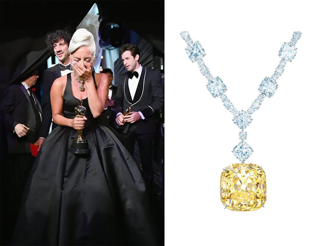 2019年,Lady Gaga凭借《Shallow》拿下了奥斯卡最佳原创歌曲奖项,而在捧得小金人之前的红毯环节,Lady Gaga就已经迎来的她的“高光”时刻。当天,她佩戴了一颗重量达128.54克拉的枕形黄钻项链,硕大的“鸽子蛋”吸引了全场人的目光。