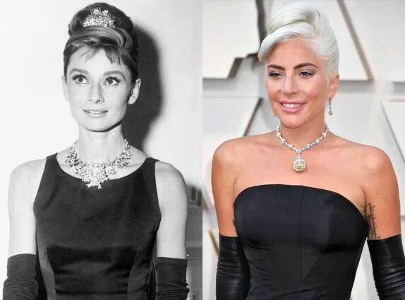 这条项链来自著名的美国珠宝品牌Tiffany,关于那枚大黄钻的背后的故事想必大家也已经听过不少,这颗黄钻仅在公开场合被佩戴过3次,在Lady Gaga此前佩戴它的名人就是大家熟知的奥黛丽赫本,Lady Gaga当晚也特意选择了一条黑色长裙,整套造型正是向赫本致敬。