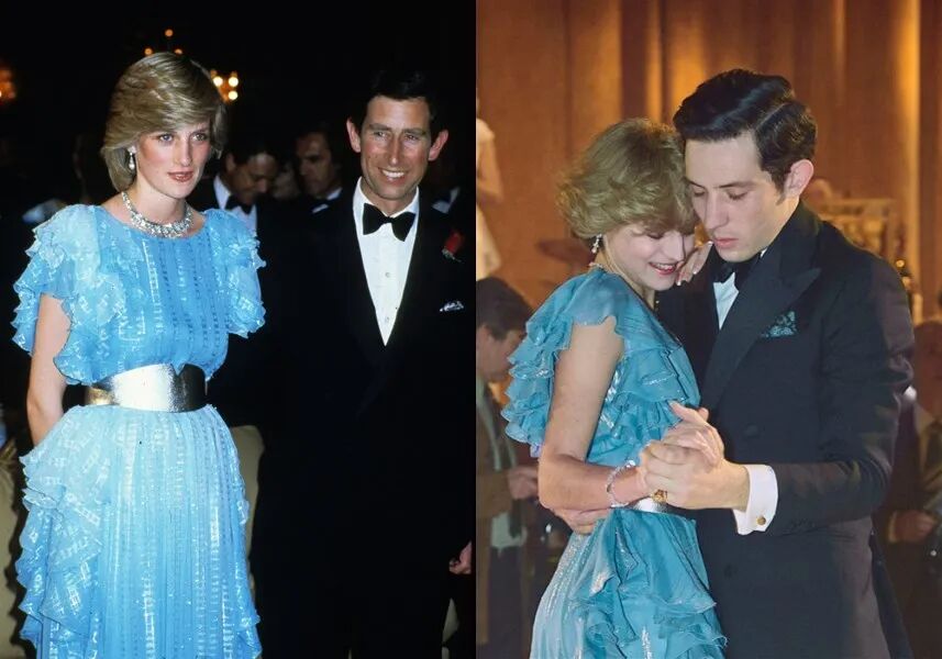 紧接着剧情到了戴安娜代表皇室去澳大利亚访问,在访澳的这段时间,戴安娜贡献了不少“神级穿搭”。SO姐印象最深的是戴安娜参加舞会时的这套造型,剧中根据原版仿制了一条波光粼粼的蓝色长裙,在灯光的照射下显得十分灵动优雅,而比裙子更耀眼的是戴安娜颈间的那条天然钻石项链。