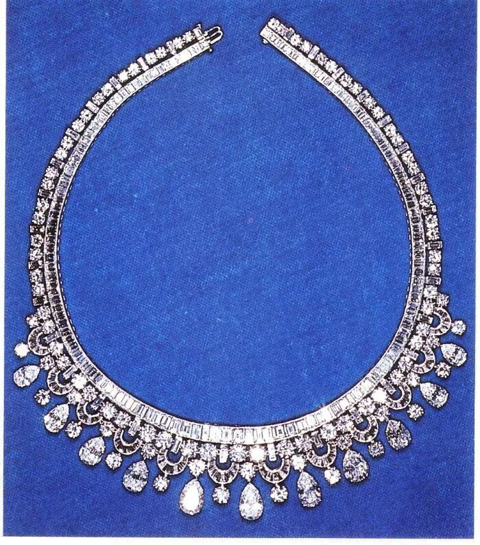 这条璀璨闪耀的天然钻石项链其实是沙特国王在1967年访问英国时送给女王的见面礼。项链上一共镶嵌了356颗天然钻石,总重达84克拉。钻石被切割成不同形状和大小,和谐细密地镶嵌在铂金底座上,钻石切割后的光芒,纯粹迷人。