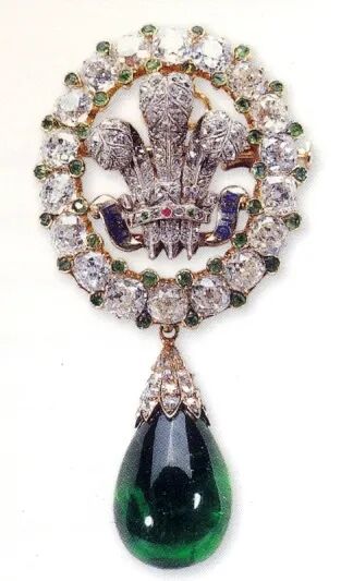 这条项链原本是一枚威尔士亲王羽毛胸针,威尔士亲王羽毛的形象起源于14世纪,是英国皇家纹章中最悠久和最知名的象征之一,这枚胸针也正是根据这个图案打造而成。胸针上铺镶了天然钻石,戴安娜在后期还为其增加了一颗水滴形祖母绿。