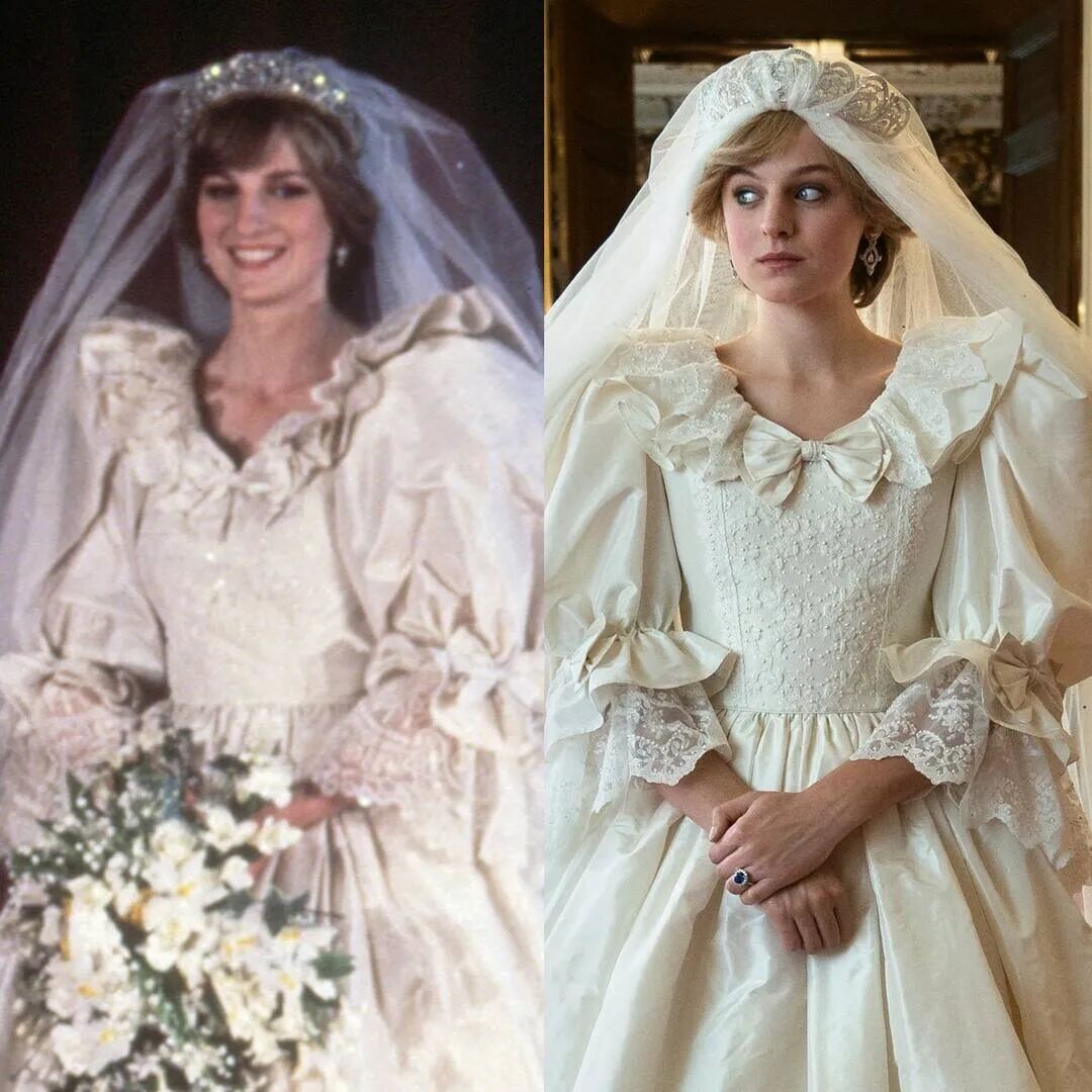 虽然婚纱几乎做到了完全复刻,但剧中戴安娜在婚礼上佩戴的冠冕和原版相比却显得有些相形见绌了。