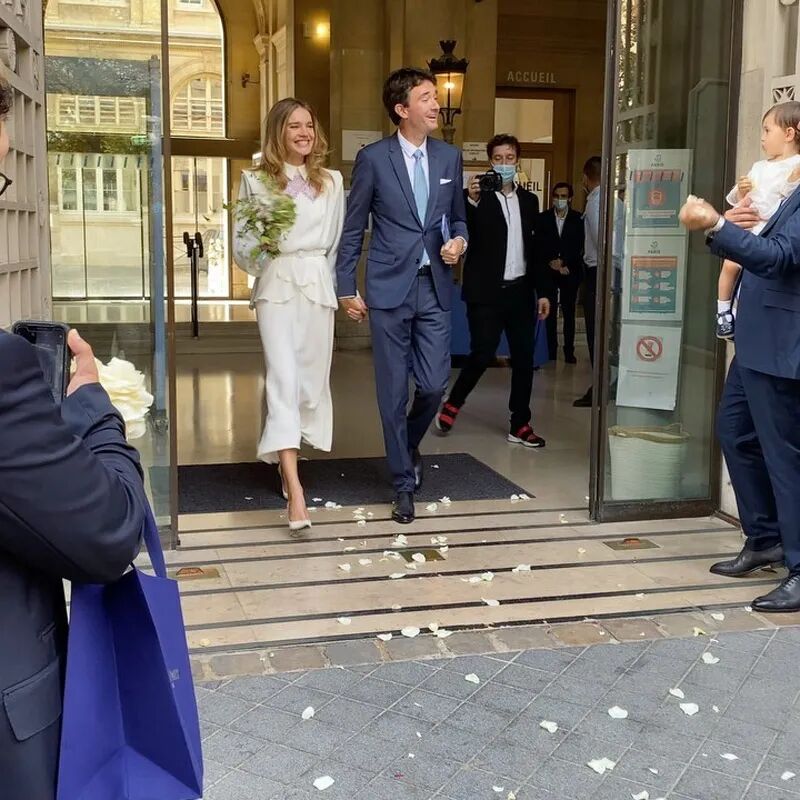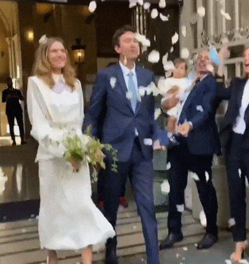 他们原本打算今年6月27日在圣皮埃尔·德·豪特维尔教堂(San-Pierre d'Hautvillers Abbey)举行婚礼,但由于疫情的影响被迫取消。不过两人在市政厅外举行了一场简单而浪漫的婚礼,亲友们在夹道两旁撒花庆祝,穿着纯白色连衣裙的水果娜和丈夫安托万笑得十分开心。