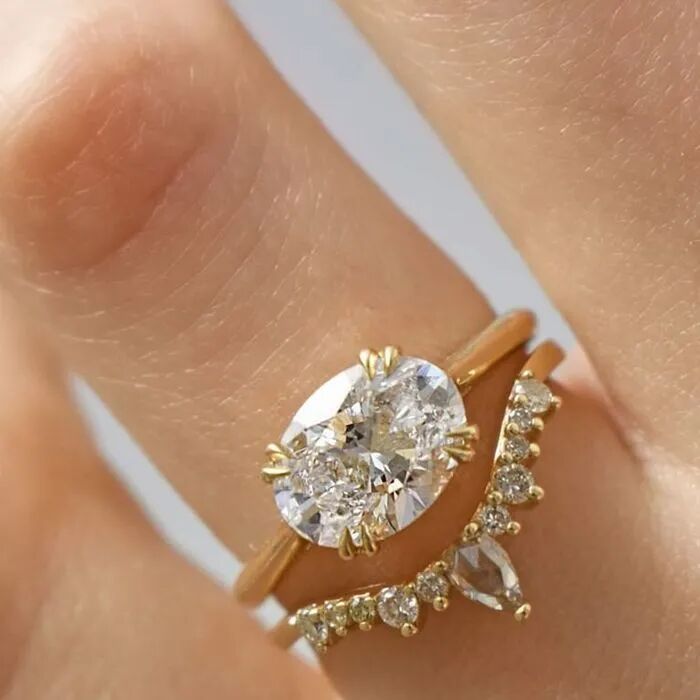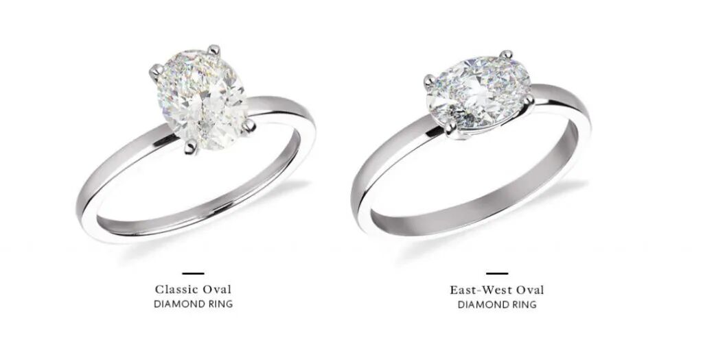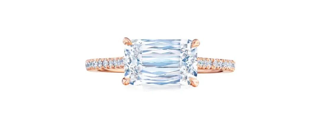 左:传统镶嵌的钻戒右:East-West风格的钻戒不同于传统的钻戒习惯将主石沿着指尖的方向镶嵌,水果娜这枚戒指将主石水平放置,而这种风格就被称为East-West,造型更现代和独特。