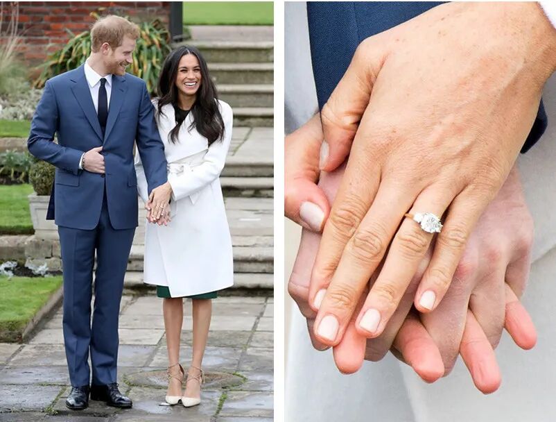 梅根王妃的婚戒就是三石款钻戒,中间大钻石来自博兹瓦纳(哈利王子向梅根求婚的地方),旁边两颗小钻石则是从哈利王子母亲戴安娜王妃的私人珠宝上取下来的。