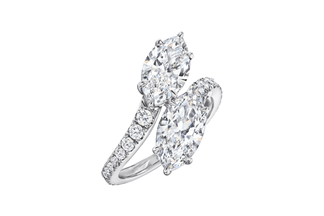 Harry Winston海瑞温斯顿Bridal Couture系列马眼形切割天然钻石戒指第二种类型的戒指名为Toi et Moi,在法语中译为“你与我”。这款设计淋漓尽致地表现出了浪漫二字,戒指中两颗彼此相邻的宝石设计代表着两个有趣灵魂的结合。