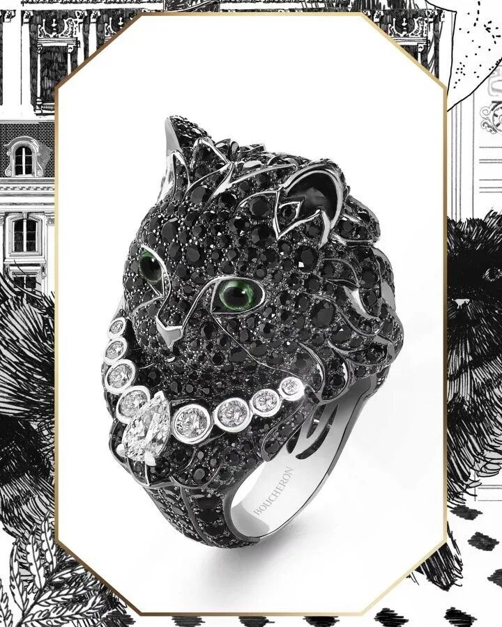 此外,Boucheron宝诗龙去年推出的Paris, vu du 26系列高级珠宝中的一枚Wladimir I&II 猫首戒指,也是通过天然黑钻,还原了一个惟妙惟肖的黑猫造型。