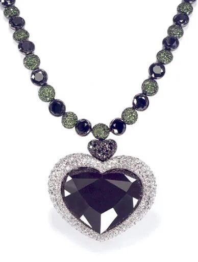 这颗The Gruosi Diamond重115.34克拉,是世界上最大的心形天然黑钻。因为这颗天然钻石的原石某些部分非常脆弱,而其他部分非常坚硬,切割难度大大增加,所以花费了3年的时间,且重量损失接近184.78克拉。最终这颗心形天然黑钻被打造成一条项链,项链上还有58.77克拉的较小的天然黑钻、378颗白色天然钻石和14.1克拉的墨绿色石榴石。