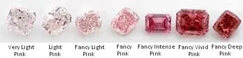 天然粉钻颜色等级并且GIA对于彩钻的评级标注按颜色饱和度从低到高划分了五个颜色等级:Fancy Light(淡彩)、Fancy(彩)、 Fancy Intense(浓彩)、 Fancy Deep(深彩)、 Fancy Vivid(艳彩),而“玫瑰花韵”便是达到了最高彩钻成色等级。