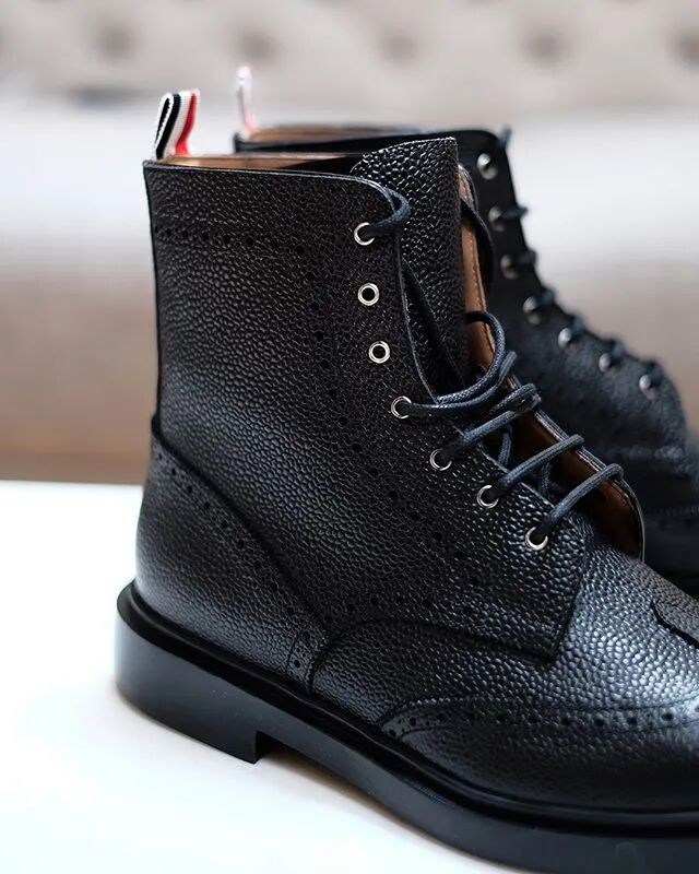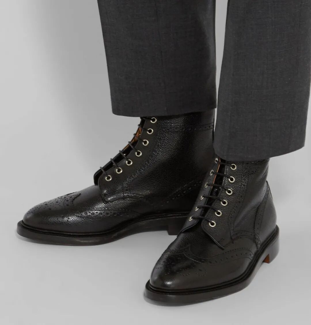虽然不是鞋履品牌,但 Thom Browne 的靴款则多为长翼布洛克的设计,搭配上黑色的荔枝纹皮革,以及特色的稍尖鞋头,把靴款的粗旷感转化为了犀利的时髦性。
