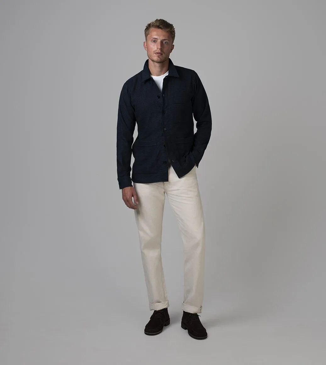 这款白色纯爱尔兰亚麻材质的拉链开襟 Overshirt,比一般的亚麻夹克更加柔软致密,贴合身形。