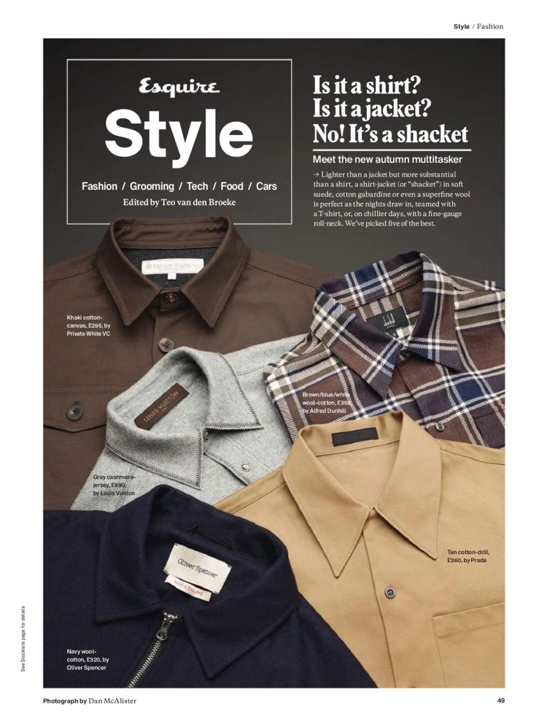 在加入一系列功能性细节和外观元素后,衬衫自然衍生出比内衣衬衫更加体面、表现更接近外套的样式(大家也会由于亲肤性的降低,搭配打底着用)。