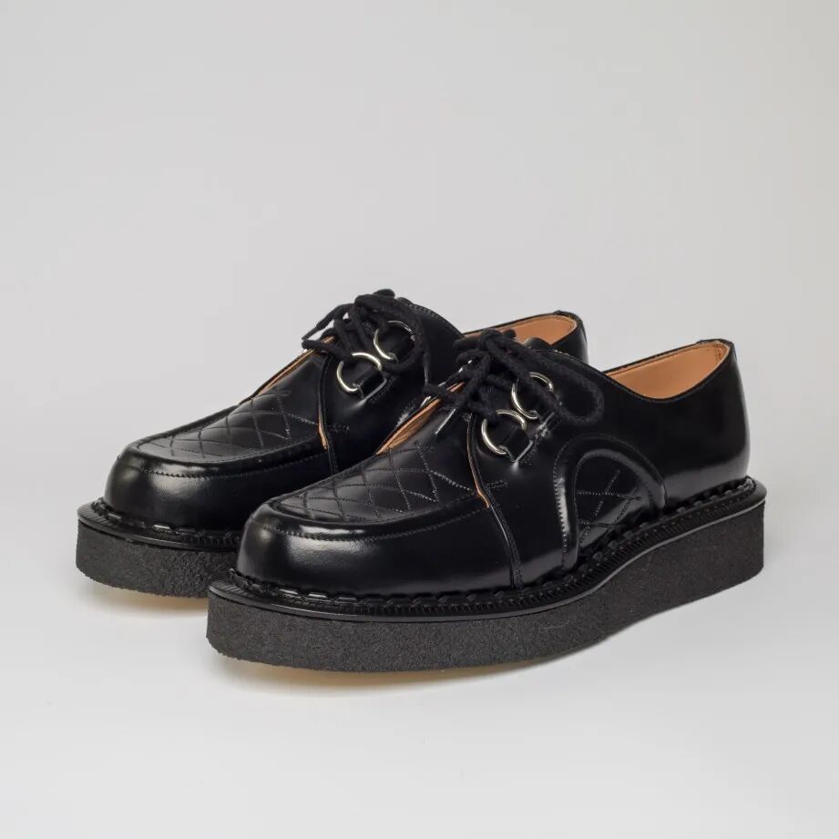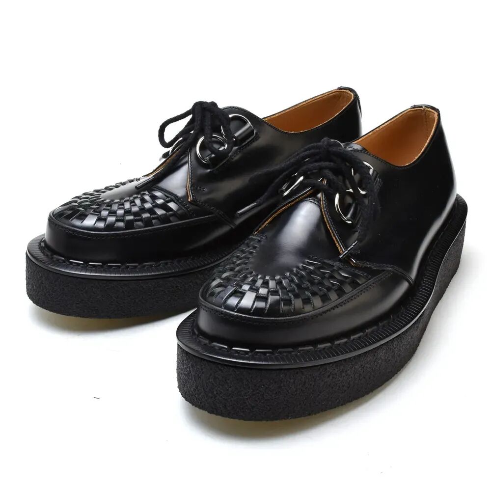 特点是以 D 形金属环替代普通的穿孔系带,其实这样的鞋款样式其它品牌也有,只是 George Cox 的花样够多,鞋面有的还加入了编织和绗缝设计,风格摇滚的同时也多了一份复古特色。