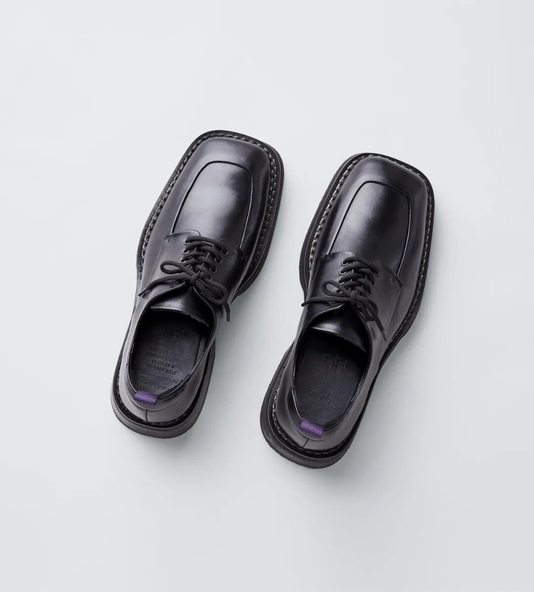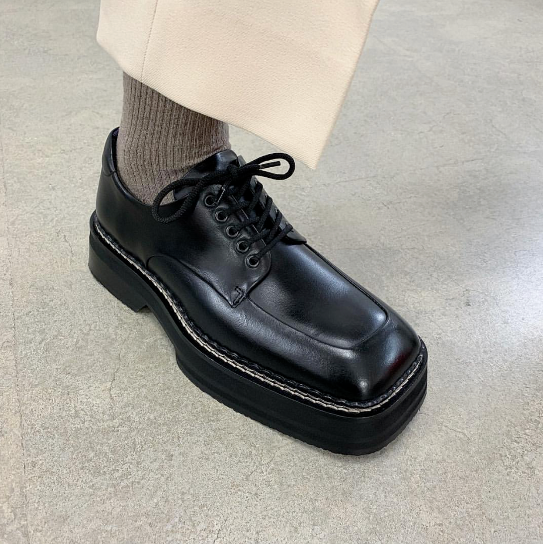 可以看到鞋型上,它是比较传统的德比款式,一个中等没有那么夸张的 square toe 方头,同时搭配了 Eytys 标志性的厚底配置。