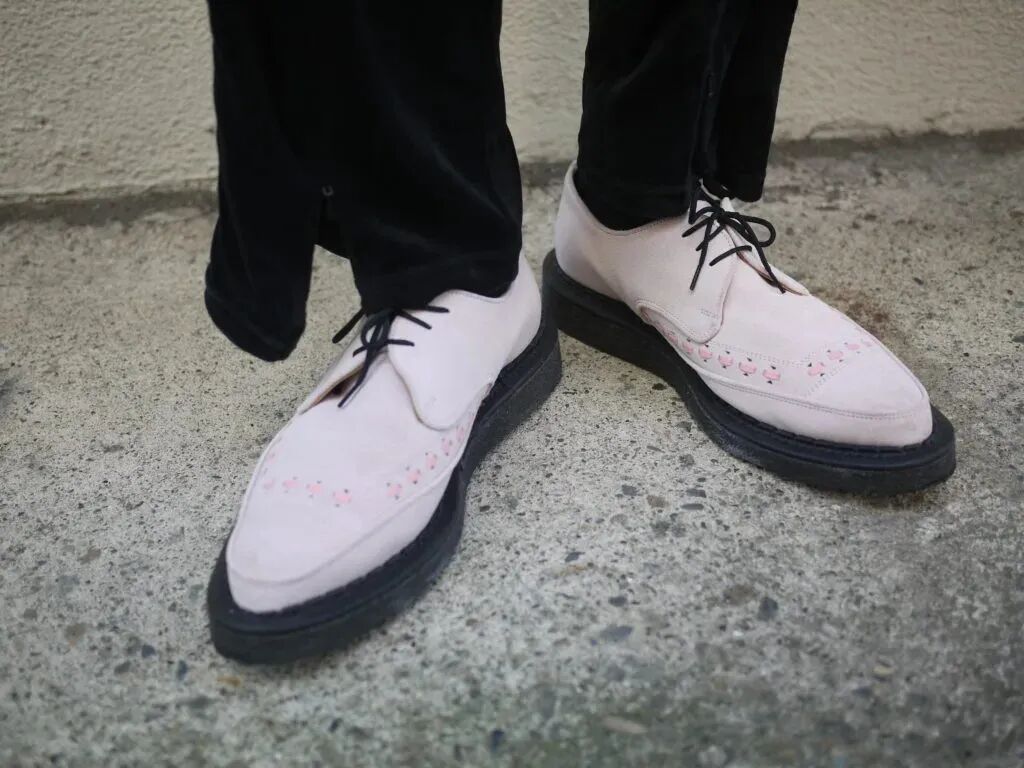 George Cox 比较出名的是尖头鞋,尤其是尖头的 Brothel Creeper,是英国 20 世纪 40 年代 Teddy Boys 群体,以及 60 年代摇滚乐爱好者的标准鞋履,属于社交声色场所“舞鞋”的一种。