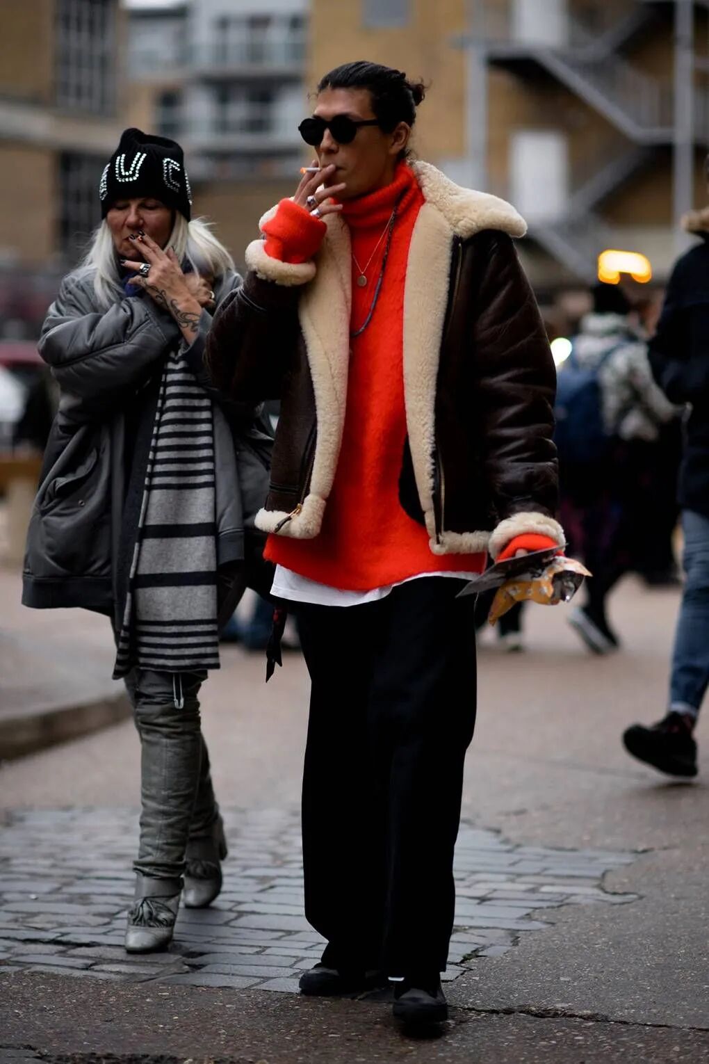 不说膨胀感,皮毛一体普遍都是大领子结构,这是它的气势来源之一,很有冲击力,而且皮革相对牛仔,以及一些斜纹工装面料来说,它又会更加醒目出众,还多了一份精致感。