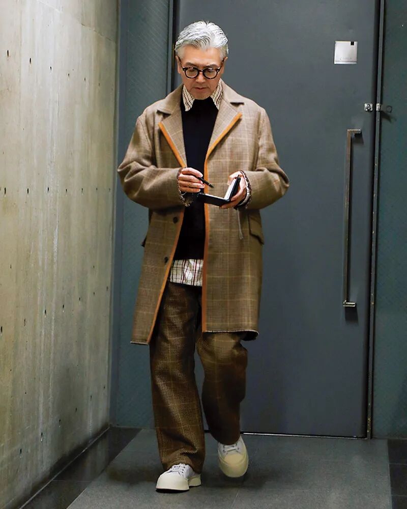而在格纹大衣外套上选择了叠穿方式搭配的藤村雅史,更是让人看到了他对 Smart Casual 日常休闲风格的把控,并不商务,更为日常,也要细致,完成度更高。