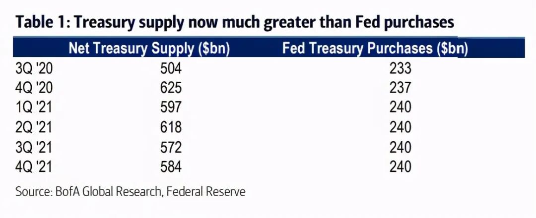正如美国银行的迈克尔·哈特奈特(Michael Hartnett)在11月13日发布的最新报告中所计算的那样,2021年,美国国债供应量将在第一季度大大超过美联储的购买量,这甚至没有考虑另一项重大财政刺激措施的可能性 。