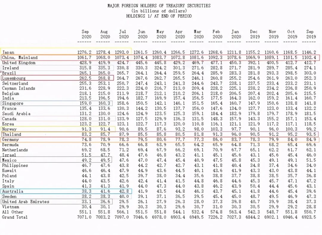 而自2018年以来,美国经济的这张债务经济模式的遮羞布就面临不断被揭开的风险。这件事情的新进展是,据美国财政部在11月18日最新公布的国际资本流动报告TIC(美债数据延后两个月惯例),如下图,全球至少12个美债的持有国在9月不同程度地抛售了美债。全球央行已经在过去的26个月内出现22个月大幅净抛售了达1.1万亿美元的美债。全球掀起的美债抛售潮表明,美国债务经济模式能否持续或已存疑。