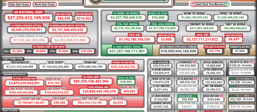 11月18日,美国国债实时钟上显示的债务总额已经接近27.3万亿美元大关,而在过去的30周内,美联储和财政部已经向市场放水达超17万亿美元的流动性和刺激资金,根据美联储最新编制的报告显示,美国金融体系的债务已经达到81万亿美元,而自2008年美国爆发金融危机以来(贝尔斯登的破产),迄今为止,他们已经向金融市场和经济主体中注入了超过36万亿美元的基础货币流动性和各种经济刺激举措,简单地换算表明,相当于每1美元的美国经济增长需要美国放水达12美元以上的债务。