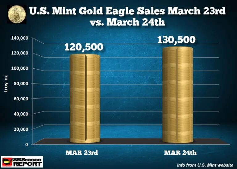 据该外媒援引的最新数据显示, 截止10月30日,2020年美国铸币局的美国鹰金币的销量达到了67.8万盎司,相当于去年全年的总销量的4倍还要多,这也就是说,2020年才刚过10个月美国金币的销量就相当于最近三年的销售量总和,正如下图数据所示,从今年3月开始,美国的金币销量就开始了快速增加的过程。