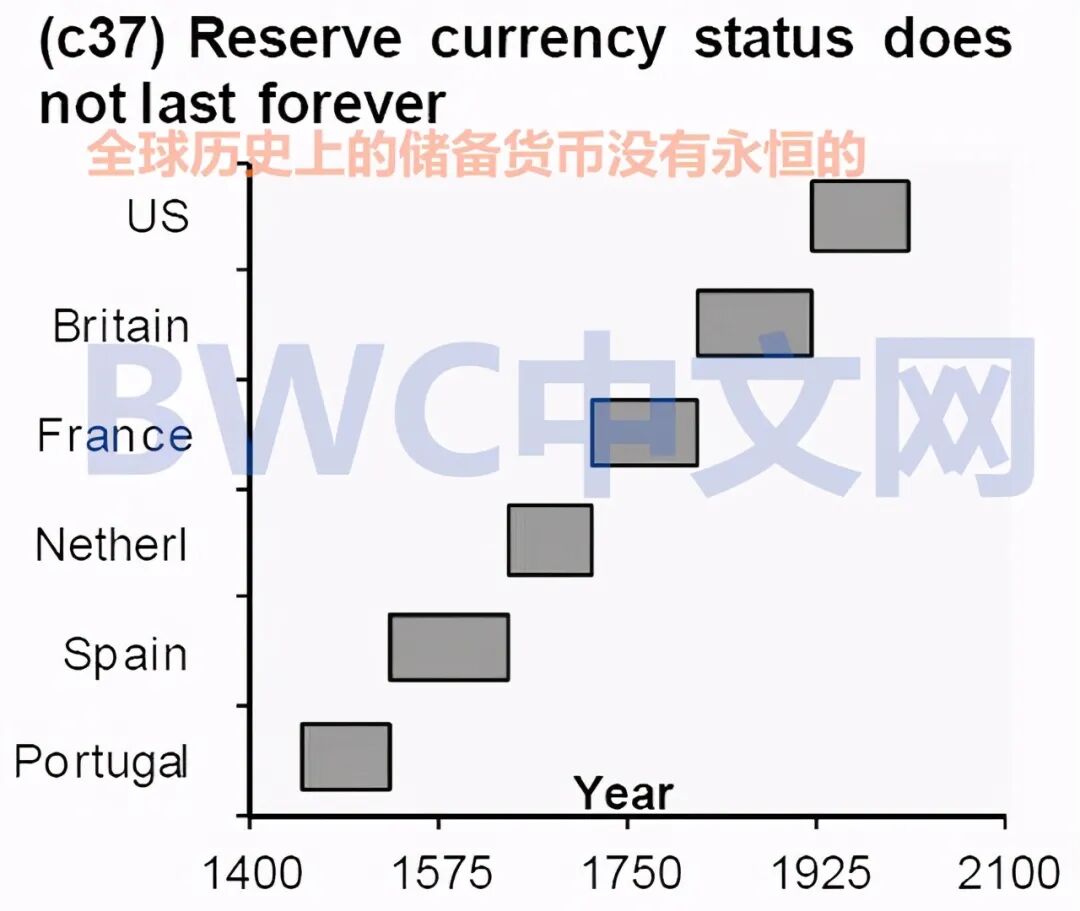 事实上,半个世纪以来,尽管美元地位看似不断加强,但其价值正在被美国洪水猛兽般的流动性和零利率所稀释掉,因信用货币是有保质期的,美元也并不是金,真正的金是黄金,比如,当美元脱离金本位和布雷顿森林体系的解散(具体细节请参考下面的第二张图),这两件事本身就在说明美元的价值在慢慢丧失,正如下图所示,全球储备货币没有永恒的。
