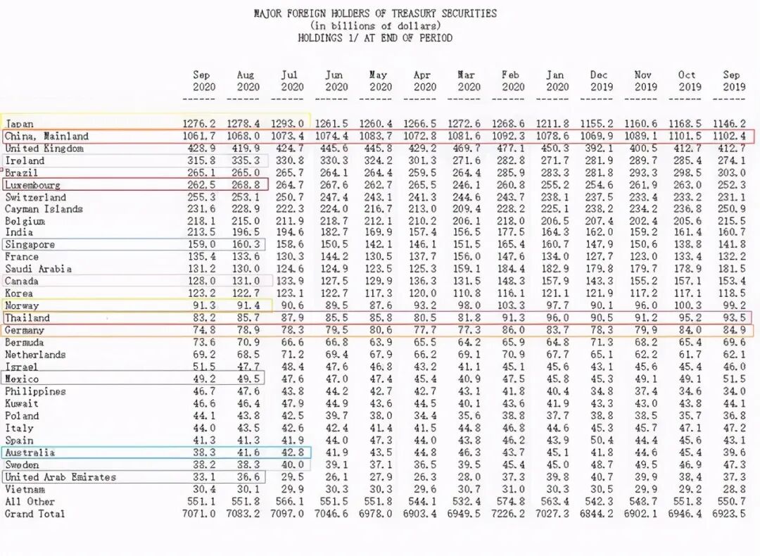 以美国国债为例,根据美国财政部11月18日公布的最新一期国际资本流动报告TIC(美债数据延后两个月惯例),截至9月,全球央行已经在过去的26个月内出现22个月大幅净抛售了达1.1万亿美元的美债。而自2018年以来,全球至少25个美债的持有国在不同月份大幅减持了美债,甚至像俄罗斯、土耳其以近乎于清零式的速度抛售了美国国债,连续数月都没有出现在美国国债主要持有者名单之列。俄媒RT称,俄罗斯正在向持有美债为0而倒计时,或将清零美债。