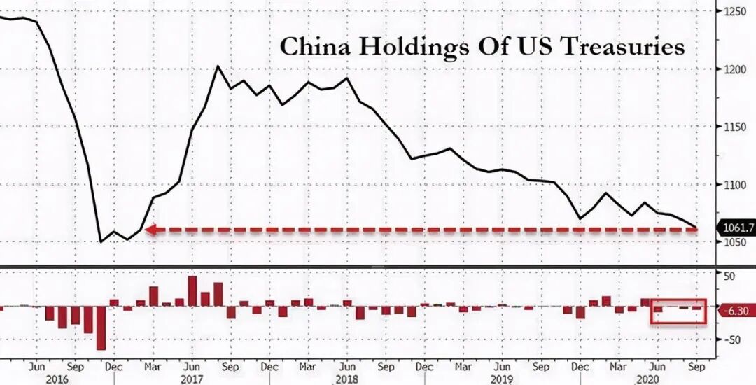 值得一提的是,中国已开始持续大幅减持美债。最新数据显示,截至9月的24个月内,中国持续累计共抛了约1663亿美债,持仓规模降至1.0617万亿美元,已降至三年来的最低水平。如下图: