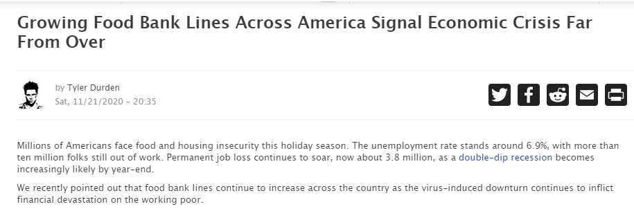 美国金融网站Zerohedge当地时间11月21日报道,美国各地不断增长的粮食银行行情,预示着经济危机远未结束。这个假期,数以百万计的美国人面临着粮食和住房的不安全状况。失业率约为6.9%,仍有超过一千万的美国人失业。随着年底前双底衰退的可能性越来越大,永久性失业人数继续激增,目前约为380万 。由于病毒引起的经济衰退继续对在职穷人造成金融破坏,因此全美各地的食物储备现象继续增加。