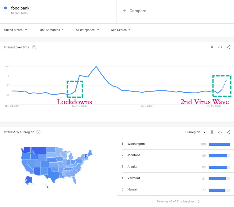 如上述景象,在全美范围内,食品银行的现象不断激增。过去一周,在美国,互联网上对“食物银行”的搜索猛增。如下图: