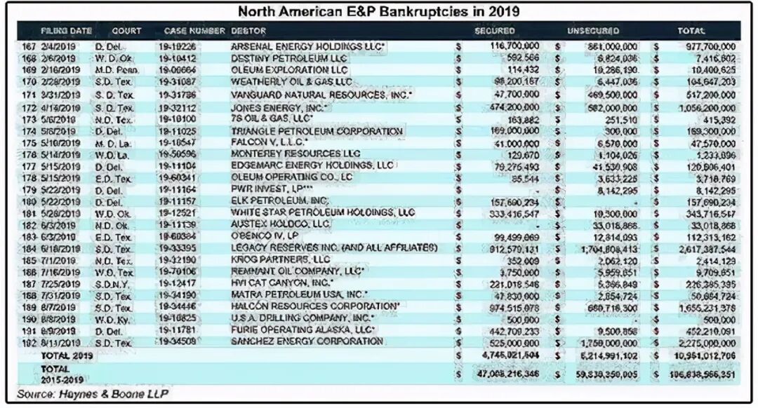 据WSJ公布的数据显示,页岩油公司的背后基本都是一些投资性质的公司,他们往往把公司业务做大后会通过出售来变现,尽管最近几周以来,亚洲买家需要增加以及不断传来新冠疫苗乐观的消息,油价出现反弹(上周涨幅达6%),但自今年3月原油价格暴跌以来,美国会计行业机构Haynes和Boone还是共记录了436起美国能源企业的破产案申请。