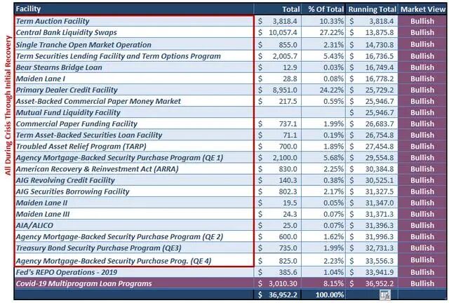 正如BWC中文网头条号团队在二周前发表的关于美联储救助金融市场的文章中所指出的那样,美联储的救助和刺激计划实际是始于2008年,当时美联储干预了贝尔斯登的破产,正如下图数据所示,从那以后他们就没有停止过,迄今为止,美联储和美国财政部已经向金融市场和经济主体中注入了超过36万亿美元的基础货币流动性和各种经济刺激举措。