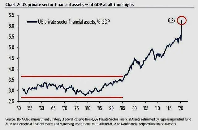 这也已经使得美联储的金融资产在美国经济中的价值占GDP的比例已经达到创纪录水平620%以上。