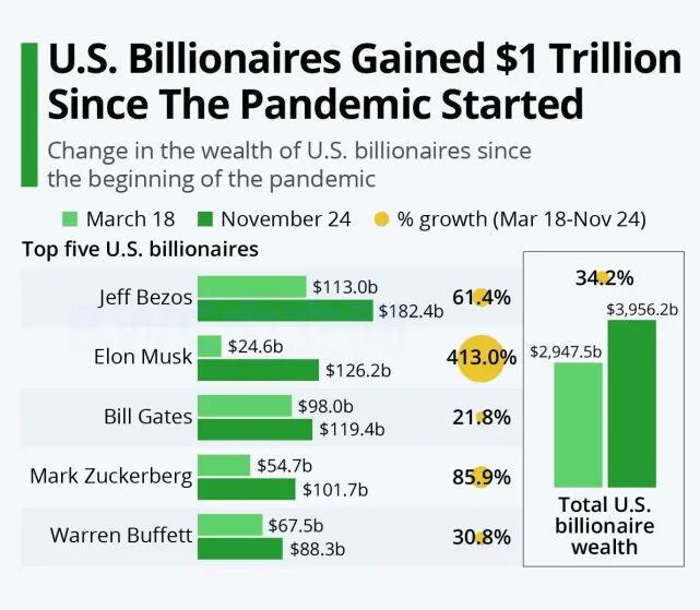 最新研究报告显示,在3月17日至11月24日之间,杰夫·贝佐斯(Jeff Bezos)的财富增长了694亿美元。亚马逊的这位老板作为地球上的首富现在拥有1824亿美元。与此同时,特斯拉和SpaceX的首席执行官埃隆·马斯克(Elon Musk)记录了榜单上最令人印象深刻的收获, 他的财富经历了飞速增长。也正是在大流行在美国不断蔓延的这段时间,他的财富猛增了414%,从“仅” 246亿美元攀升至1,262亿美元,使他成为仅次于贝佐斯的全球第二大富翁。