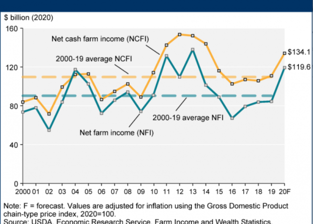 据美国媒体最新报道,根据美国农业部(USDA)12月最新美国《农场收入预测》报告预测,2020年美国农场净收入最终可能将为1,196亿美元,或为2013年以来最高(7年以来最高水平)。