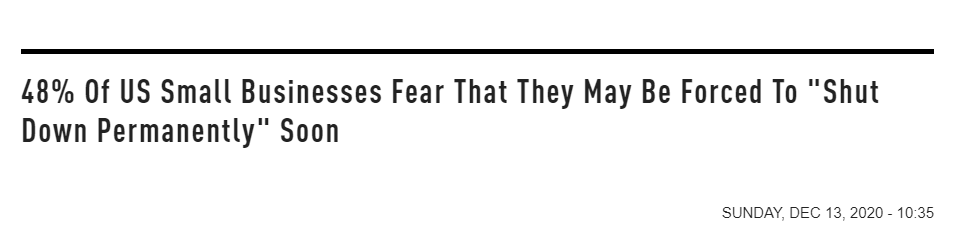 然而这却并不能改变美国经济萧条的景象,这一点,美国的许多小企业面临的危机就可见一斑。事情的另一个新变化是,美国金融网站Zerohedge12月13日报道,根据 Alignable最新一项调查,美国48%的小型企业担心很快就会被迫“永久关闭”。甚至在1930年代的大萧条时期,我们都没有看到这样的事情。