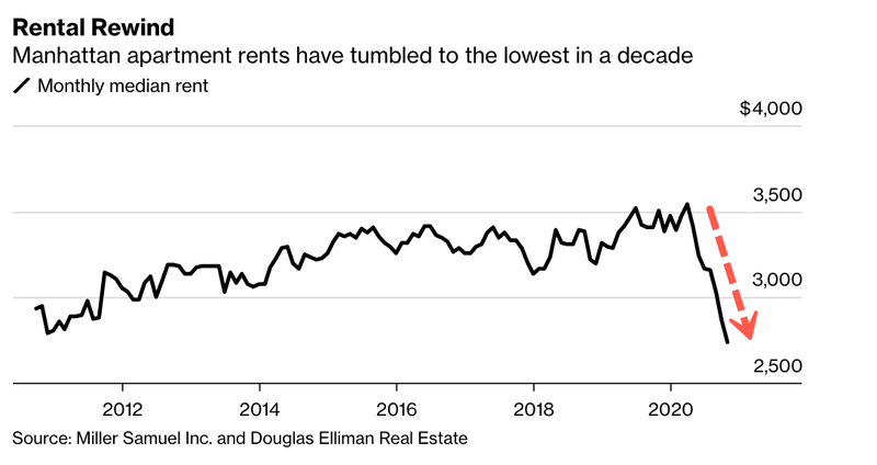 根据米勒·塞缪尔公司(Miller Samuel Inc.)和道格拉斯·埃利曼房地产公司(Douglas Elliman Real Estate)的最新报告,该行政区的中位数租金价格在11月比去年同期暴跌了22%,至每月2,743美元。