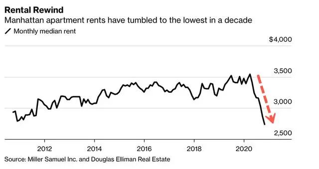 美媒12月12日报道,由于库存增加,曼哈顿公寓租金下降至十年来的最低水平。曼哈顿的租金市场见证了租金的又一次大跌,跌至十年低点。根据米勒·塞缪尔公司(Miller Samuel Inc.)和道格拉斯·埃利曼房地产公司(Douglas Elliman Real Estate)的最新报告,该行政区的中位数租金价格在11月比去年同期暴跌了22%,至每月2,743美元。