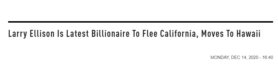 迹象表明,美国大量富人上演出埃及记的事情进一步升级。新的进展是,美国金融网站Zerohedge12月14日报道,加利福尼亚的无情流亡仍在继续:在特斯拉老板埃隆·马斯克(Elon Musk),Splunk首席执行官道格·梅里特(Doug Merritt)和喜剧演员乔·罗根(Joe Rogan)都离开加州迁移到德克萨斯州奥斯汀之后,甲骨文公司也决定撤离加州,同时,全球第11大最富有的人,甲骨文公司的老板埃里森(Ellison)宣布,我已经搬到了夏威夷的拉奈岛(Lanai)。