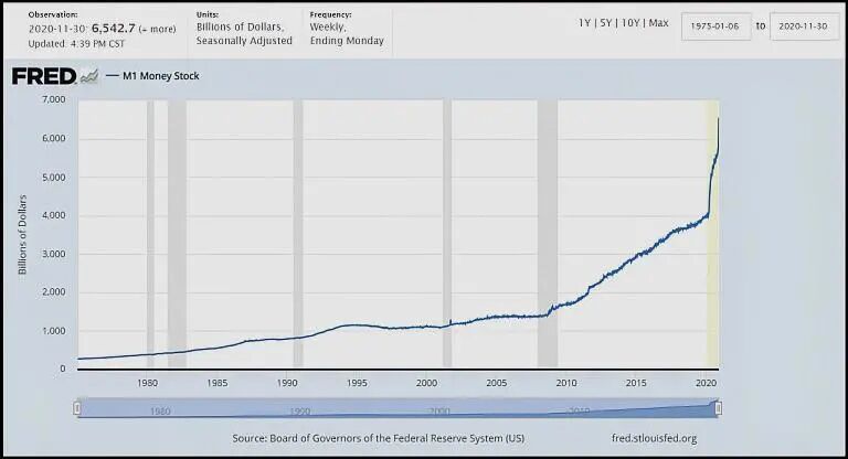 过去两周美国货币供应量的增加绝对令人震惊,在美国财政部和美联储的操纵下,根据圣路易斯联邦储备银行在12月17日更新的数据,显示从11月16日到11月30日这两周,美国M1货币供应总量增加到了令人震惊的8,090亿美元,相比之下,从3月16日到3月30日因新冠病毒在美国蔓延后首次封锁经济时才增加了3,880亿美元。