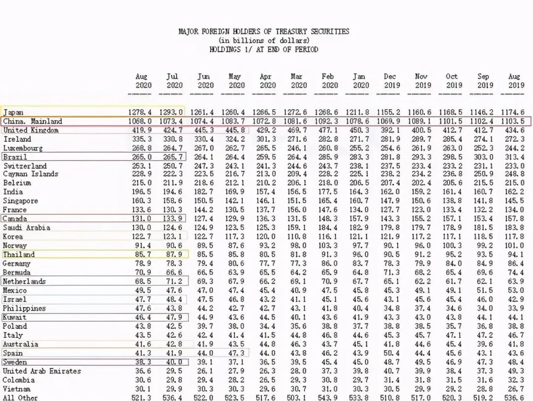 以美国国债为例,根据美国财政部10月中旬公布的最新一期国际资本流动报告TIC(美债数据延后两个月惯例),截至8月,全球央行已经在过去的25个月中第23个月净减持美债,总出售额近10285亿,这也是全球央行抛美债量的创纪录水平。其中,中国、日本、英国、巴西、加拿大、泰国、荷兰、以色列、科威特、澳大利亚、西班牙、瑞典至少12国都不同程度地减持了美债。这意味着,全球主要央行正在掀起减持美债潮。