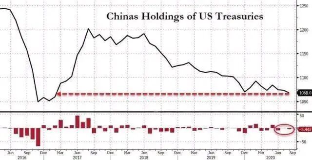 而这件事情的一个进展是,据美国财政部最新一期国际资本流动报告(美债数据延后两个月公布惯例),中国8月减持54亿美债,这是自5月以来的连续第三个月抛售,而在此之前的23个月内,中国已经共减持了1501亿美债,所持美债仓位量降至2017年3月以来的最低水平。目前持有美债总额约为1.07万亿美元。也就是说,中国已经开始连续减持了美债。