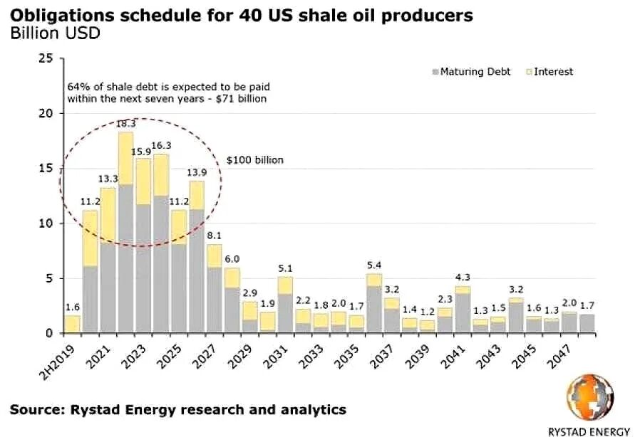 我们综合美国能源经济与金融分析研究所、行业机构和穆迪发布的最新研究显示,北美油气公司在未来四年面临2000亿美元的到期债务,并将在2021年进一步恶化,其中仅2020年的到期额就高达400亿美元,正如下图数据显示,美国排名前40位的页岩油生产商预计将在债务分期付款和利息方面花费约1000亿美元。