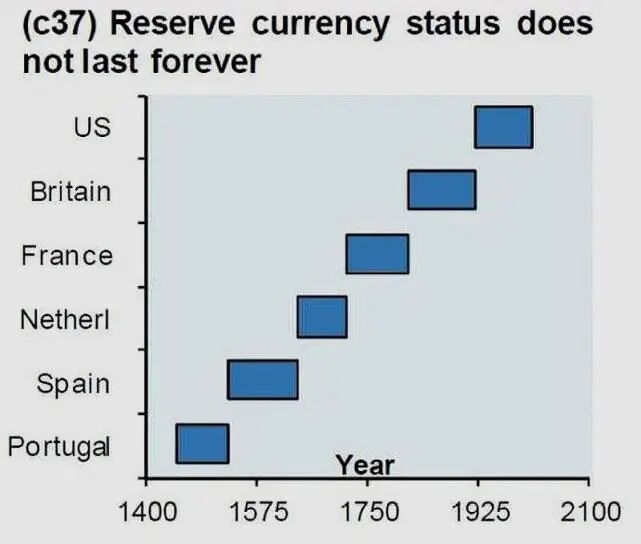 美国著名投资人吉姆·罗杰斯一周前在接受俄媒RT采访时称,“美元正处于失去其作为世界主要储备货币地位的边缘”,正如下图货币历史数据所示的那样,全球主要储备货币的地位从来都没有是永恒不变的。